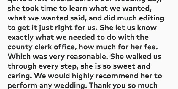 It was a pleasure working with Nancy. She was early, super helpful, it was a very hot day and she made our ceremony meaningful but not dragged out and it was honestly everything I could have hoped for. She’s responsive and answered all my questions. 😊 Thank you Nancy for making my day special and beautiful.